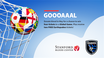 Donate at any of Stanford Blood Center’s (SBC) mobile drives or centers this May 1 – 31 for a chance to win tickets to a Global Game and automatically receive two free tickets to a San Jose Earthquakes game!