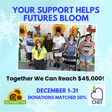 To maximize this wonderful CHEF match opportunity, we are asking our supporters to donate to Sunflower Hill via the CHEF platform throughout the month of December.
